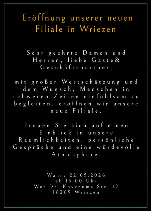 Der Gedanke an den eigenen Tod oder den eines Angehörigen wird meist verdrängt. Der Tod reist eine unfassbar schmerzliche Lücke in die Familie und zur Trauer kommt oft die Hilflosigkeit der Hinterbliebenen. In dieser schweren Zeit möchten wir Ihnen als zuverlässiger Partner bei Bestattungen, Trauerfeiern und allen anderen Dienstleistungen, die mit dem letzten Abschied eines Menschen verbunden sind, zur Seite stehen und Trost spenden wenn die Trauer Sie gefangen nimmt.